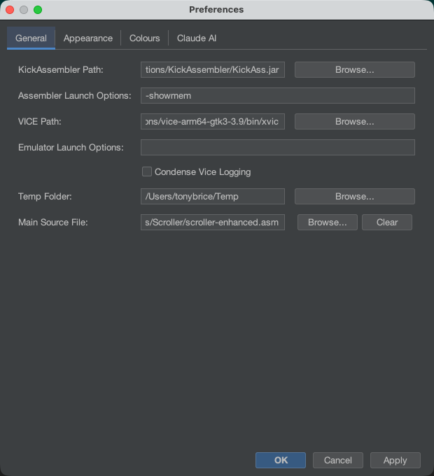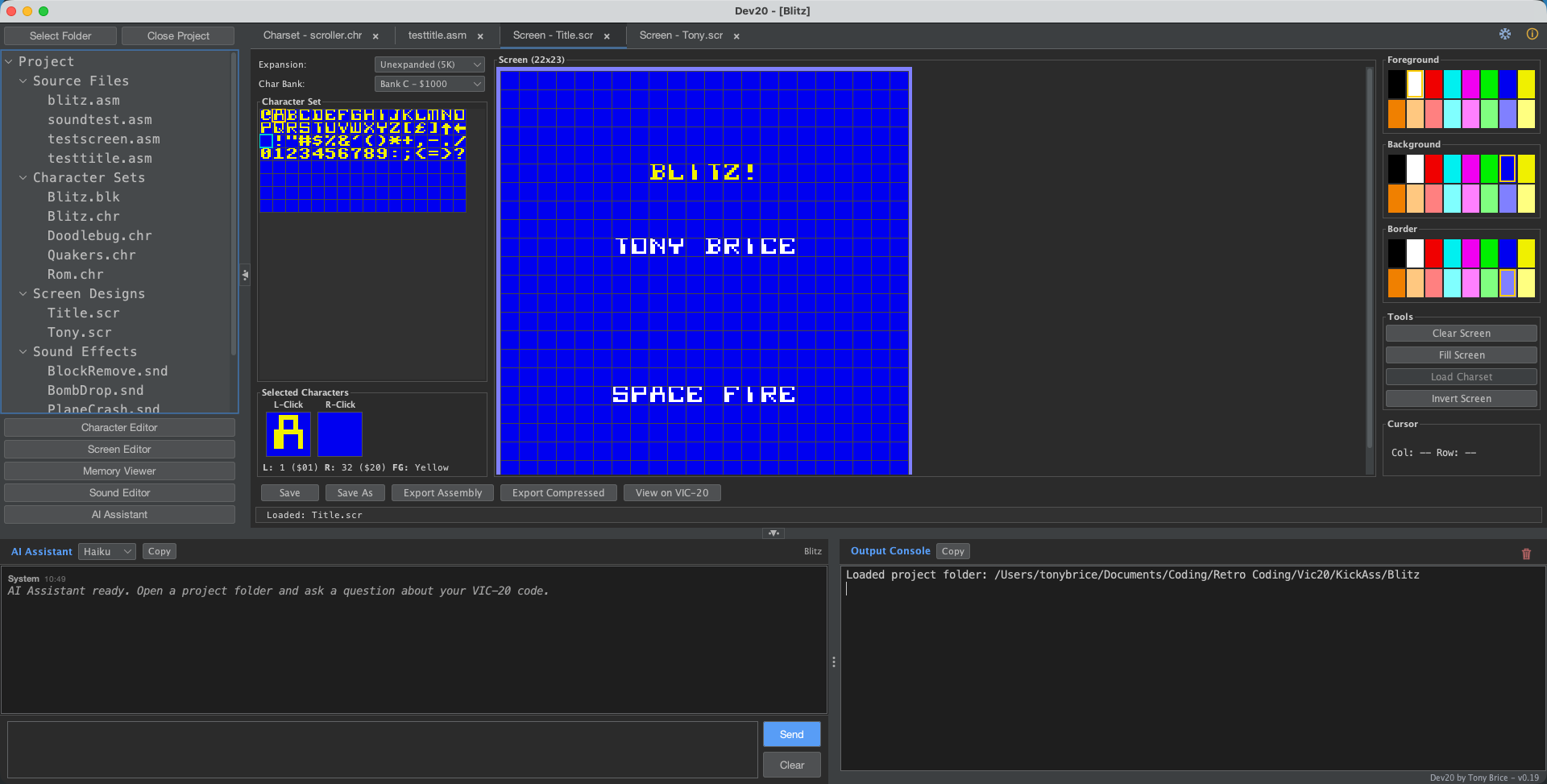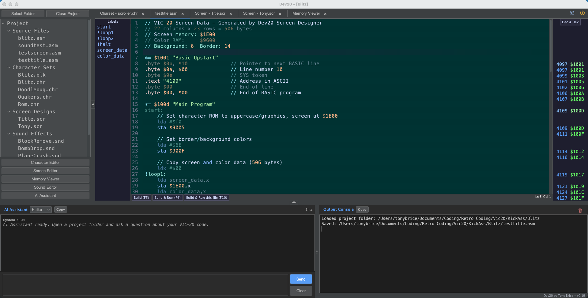 Dev20 will let you set up memory management for all aspects of your projects, such as where the character memory starts. It has a built in screen builder, custom character set creation, project management, integration with Vice for building and testing your code, Claude code assistance built in and multiple files can be open in a Visual studio like tab system.