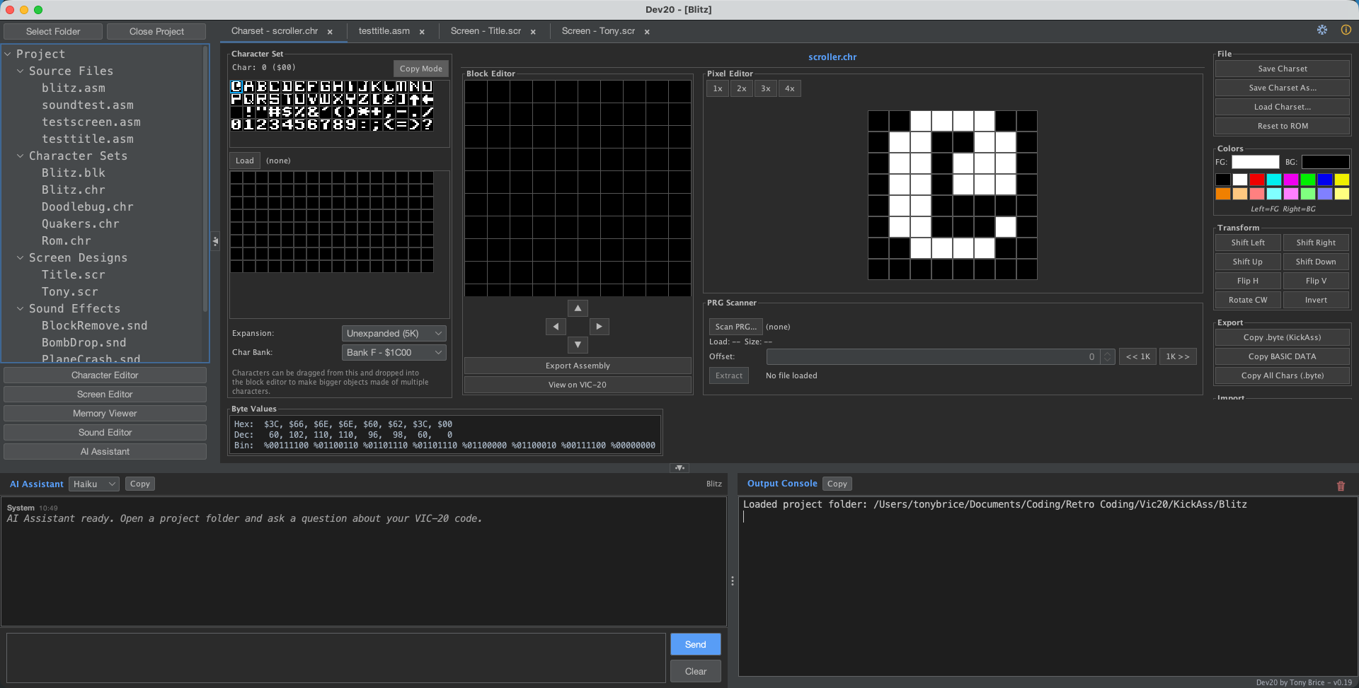 Also included is a powerful character set grabber tool which lets you load any Vic 20 .prg file into Dev20 and then check the available memory areas to look for custom designed characters. Then you are able to use a drag system to copy any of these into your own custom character set. This is ideal for grabbing a nice, custom alphabet to save you designing your own, such as in the screenshots where I’ve used the A-Z from Doodlebug. Dev20 has built in simple routines that can be run from a button to show custom screens and character sets within Vice to see how they will look on the real hardware. The character set designer also features a block area where multiple characters can be stacked together if you are designing a bigger image with characters, for example.